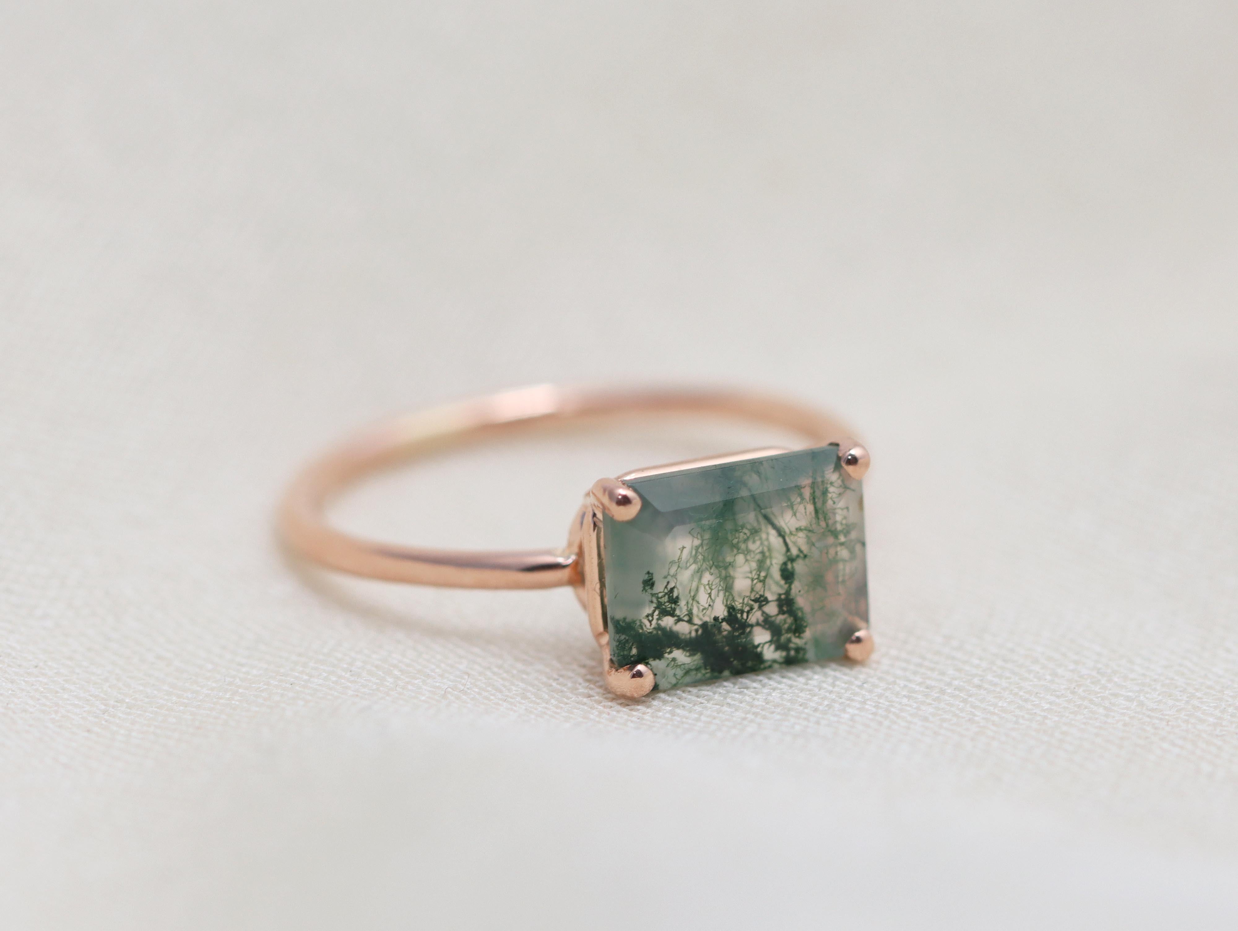 - 9x7 emerald cut moss agate stone in East to West orientation