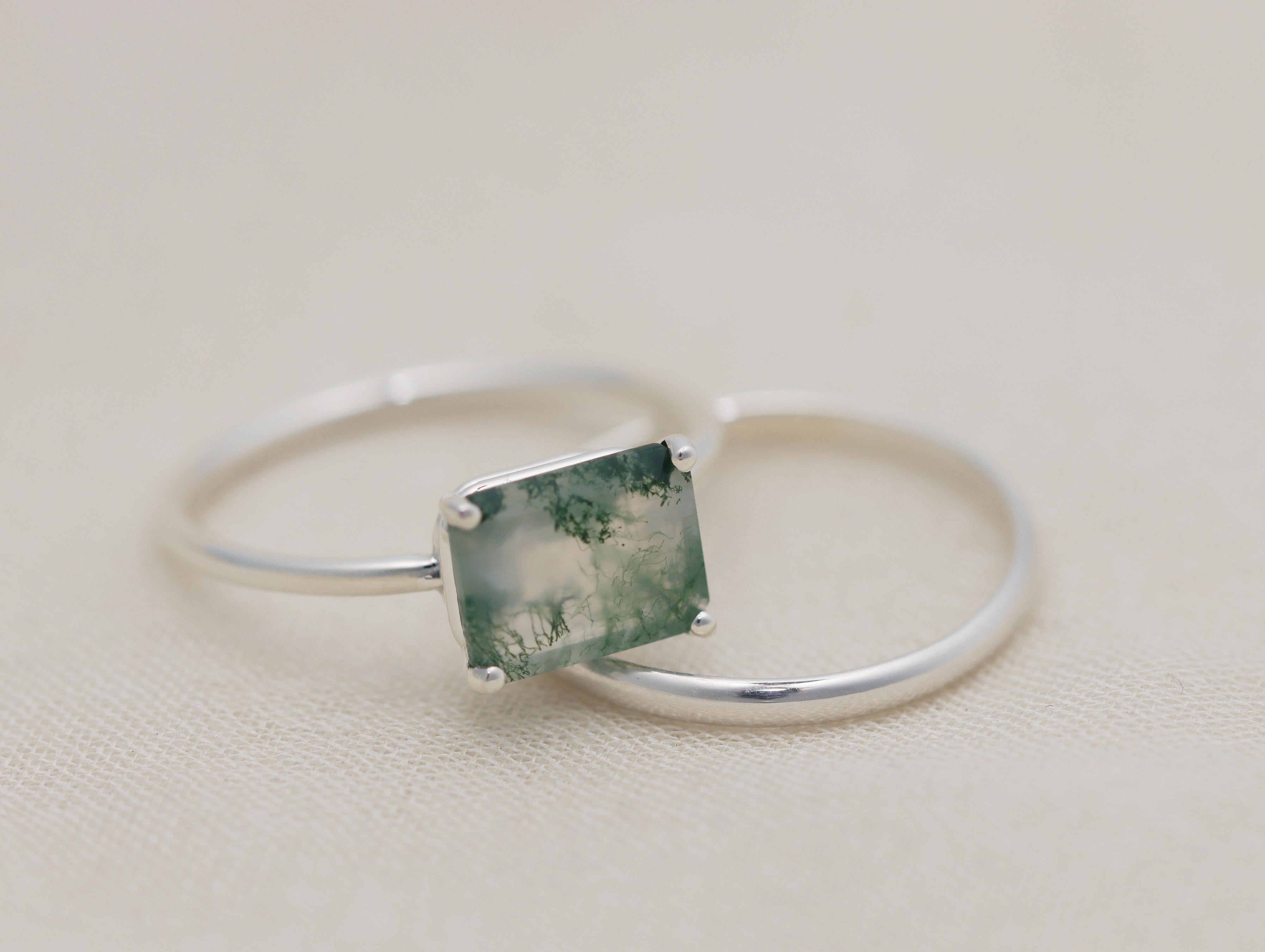 This bridal set includes an East West emerald cut moss agate solitaire ring and a 2mm wide half round wedding band. Each ring is also available separately for sale in my shop.