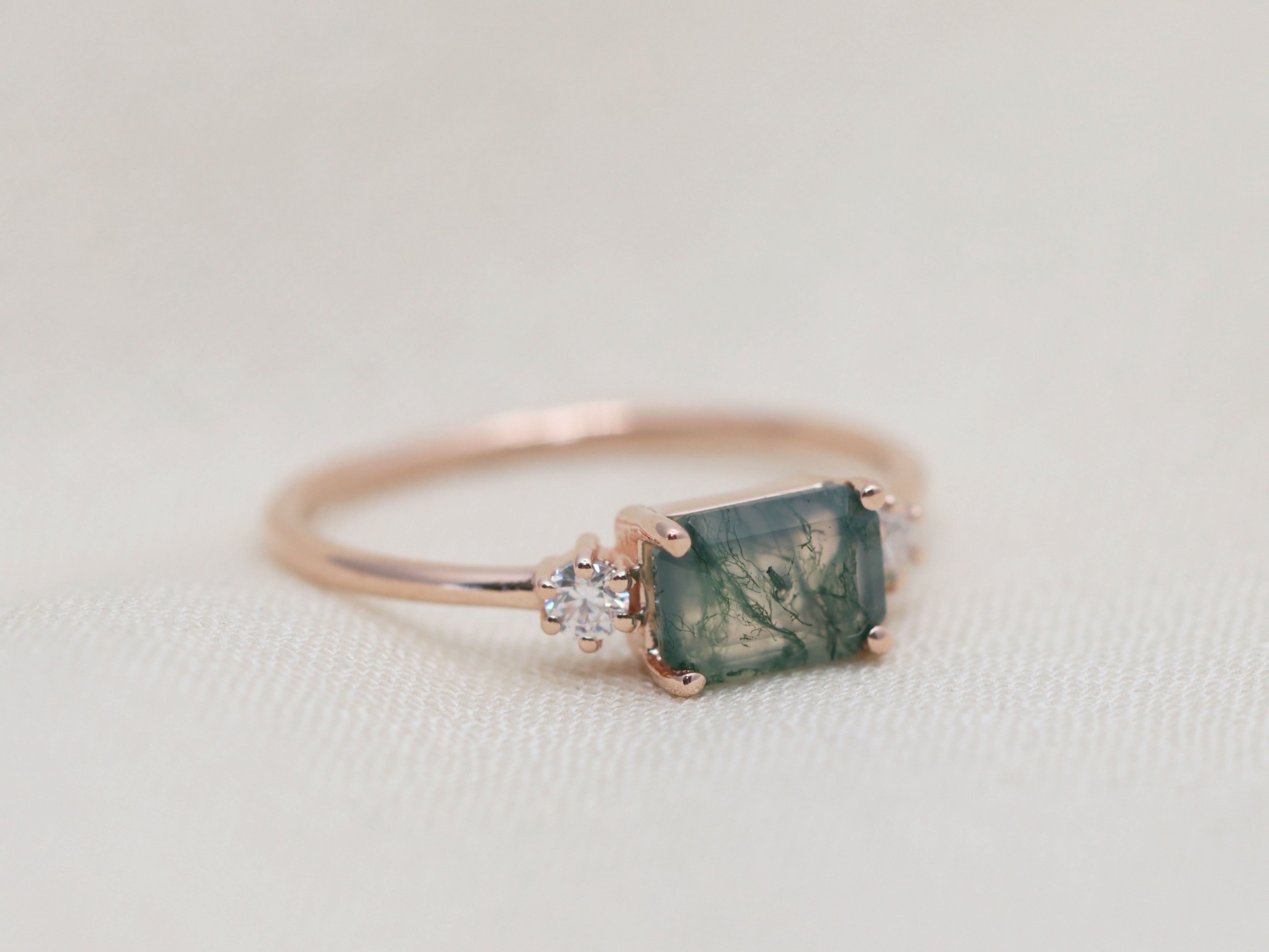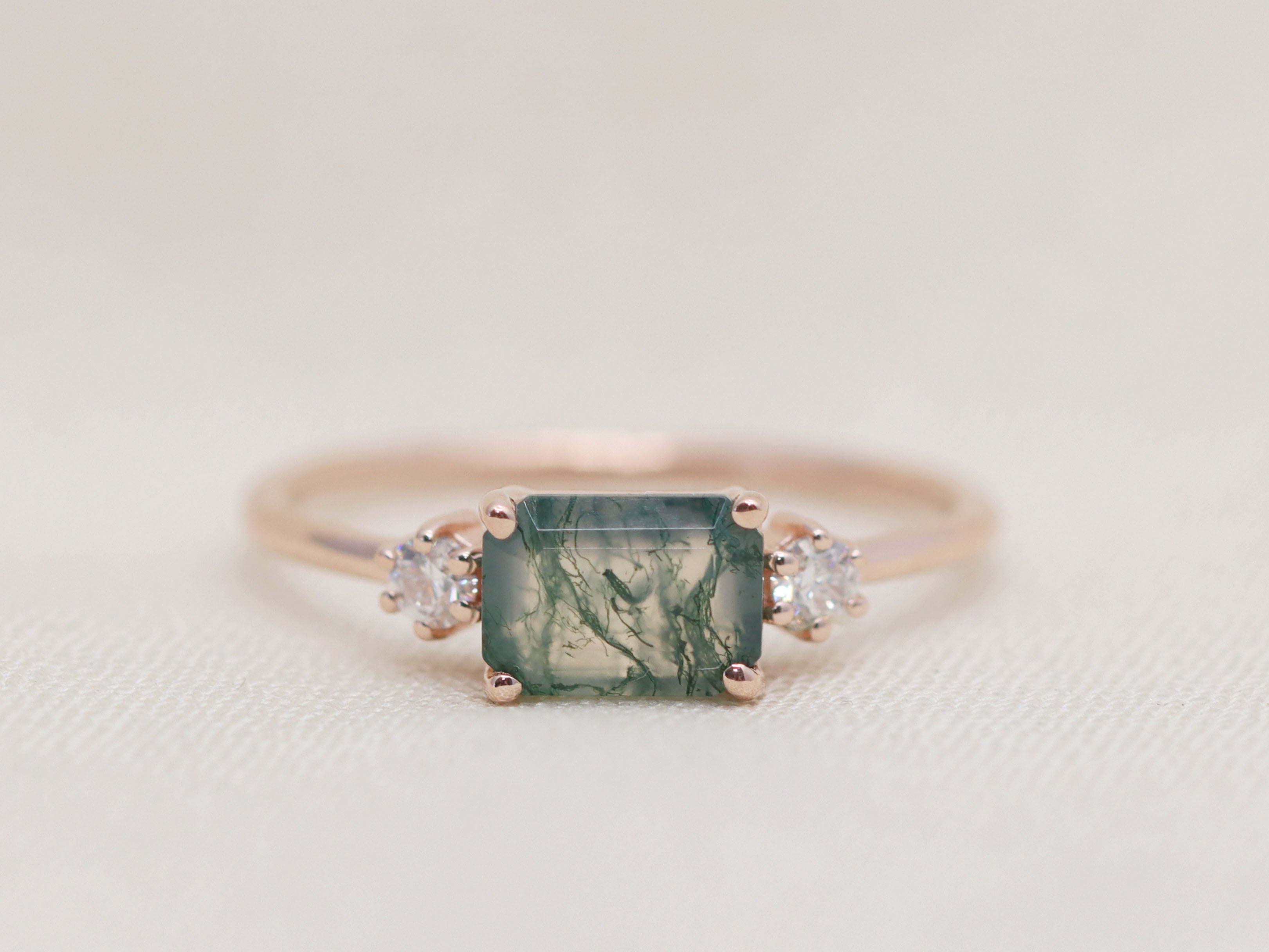 Trilogy Ring with Moss Agate and Diamonds - 7x5 Emerald