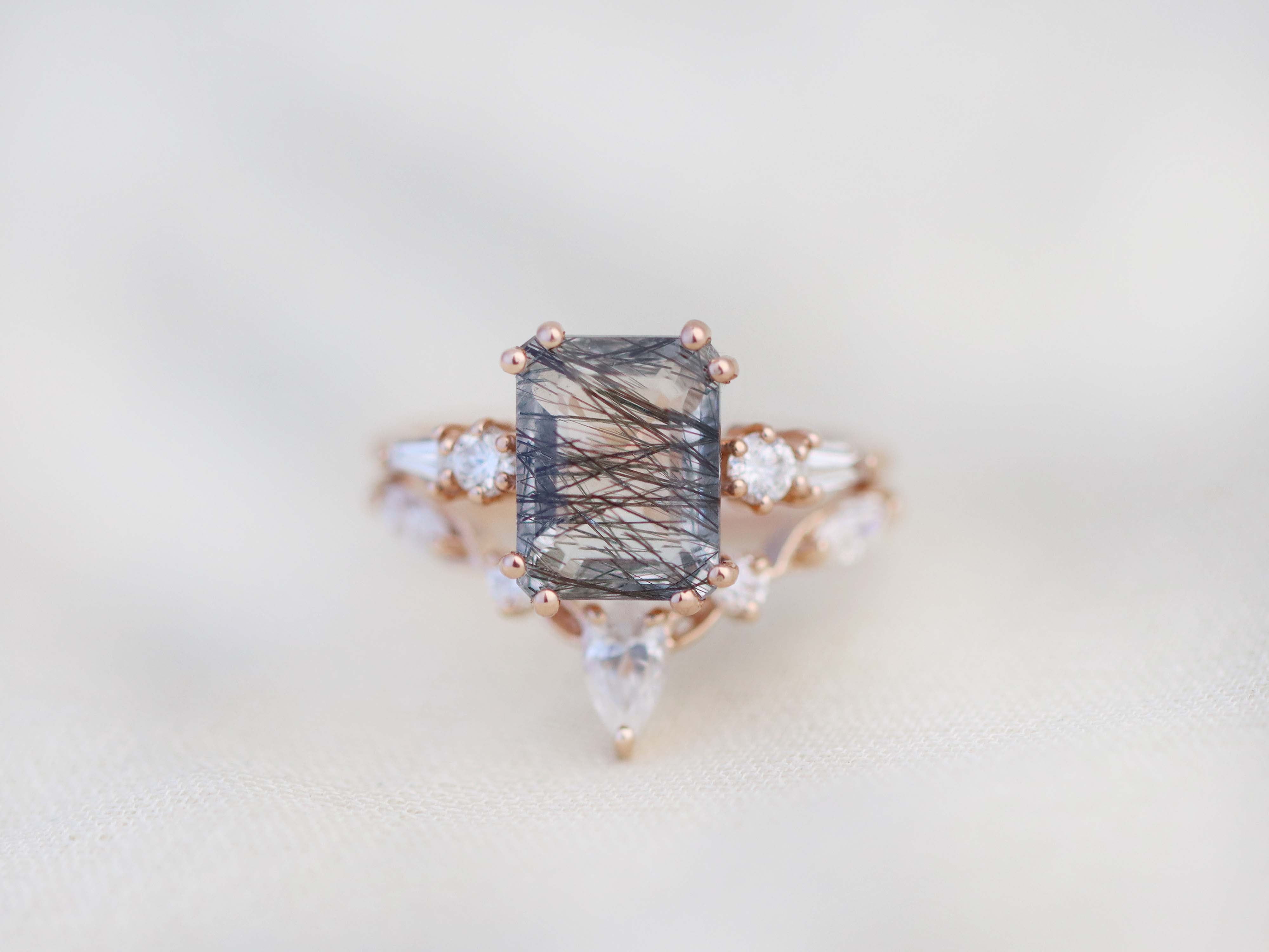- 9mm x 7mm emerald cut tourmalinated quartz center stone