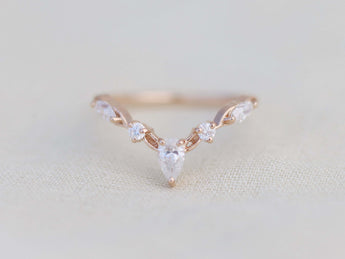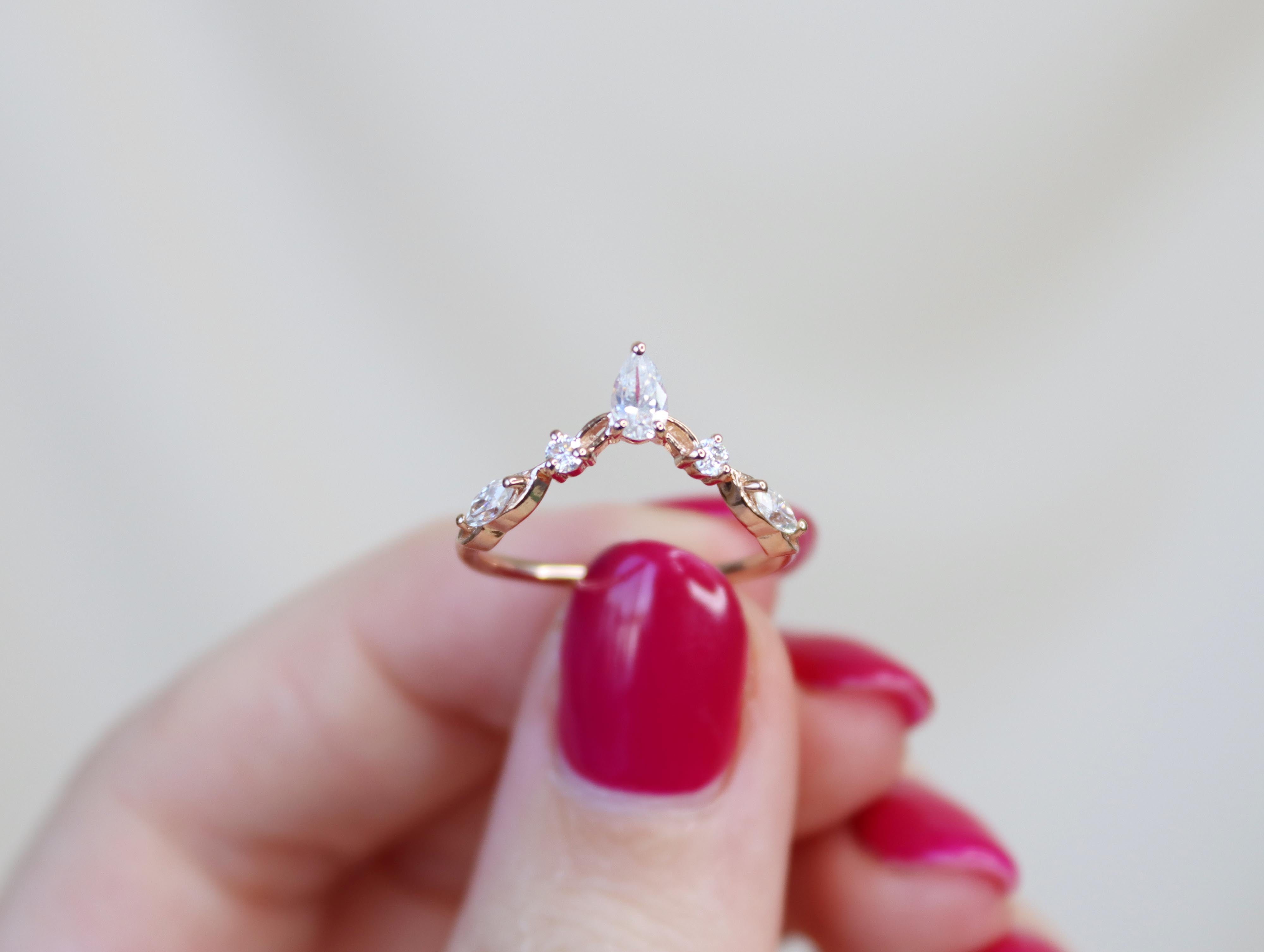 - chevron shaped ring with vine designs and pear, round and marquise accent gemstones