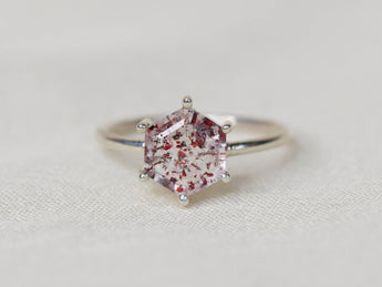 - 8mm hexagon faceted strawberry quartz in a prong setting