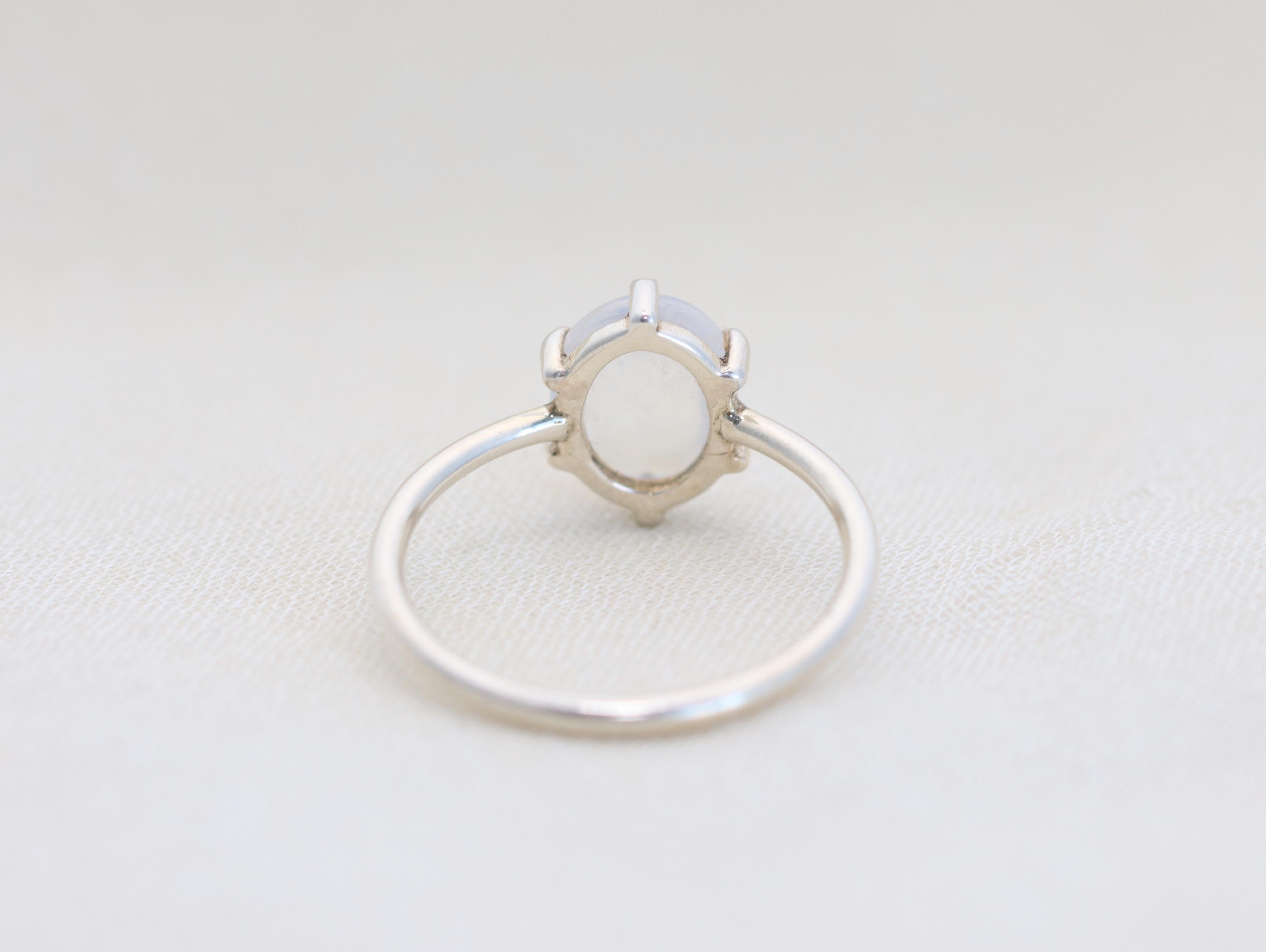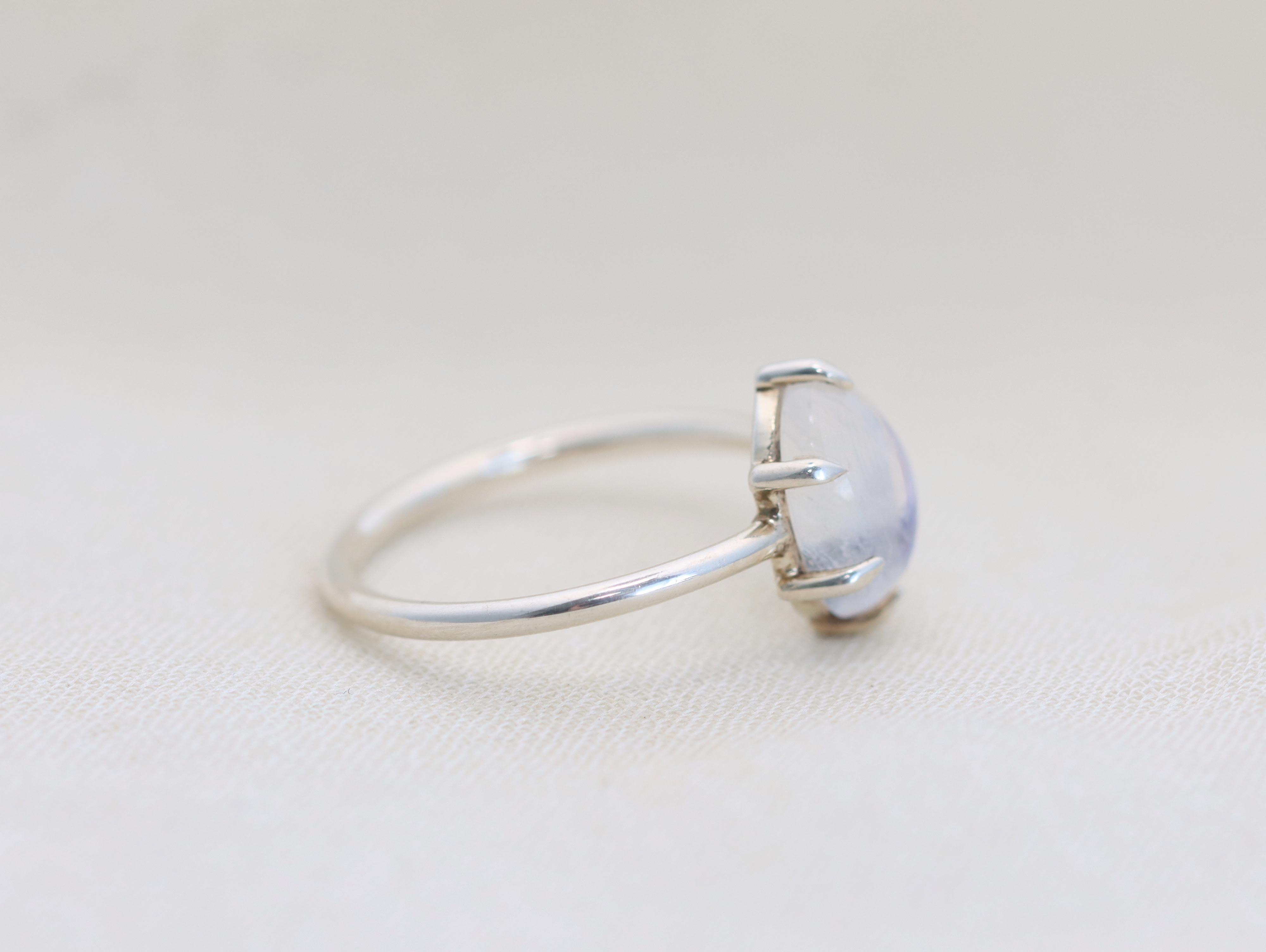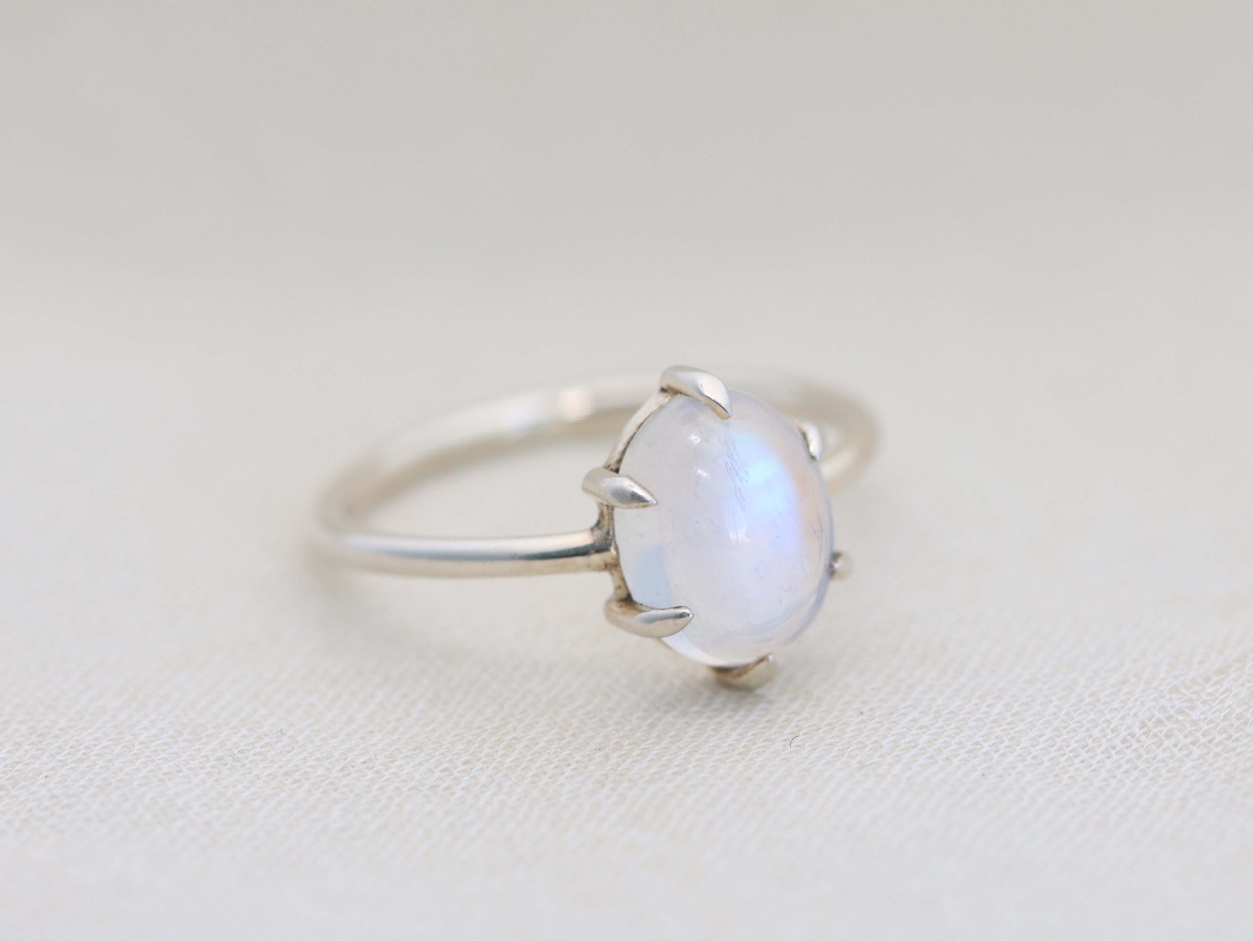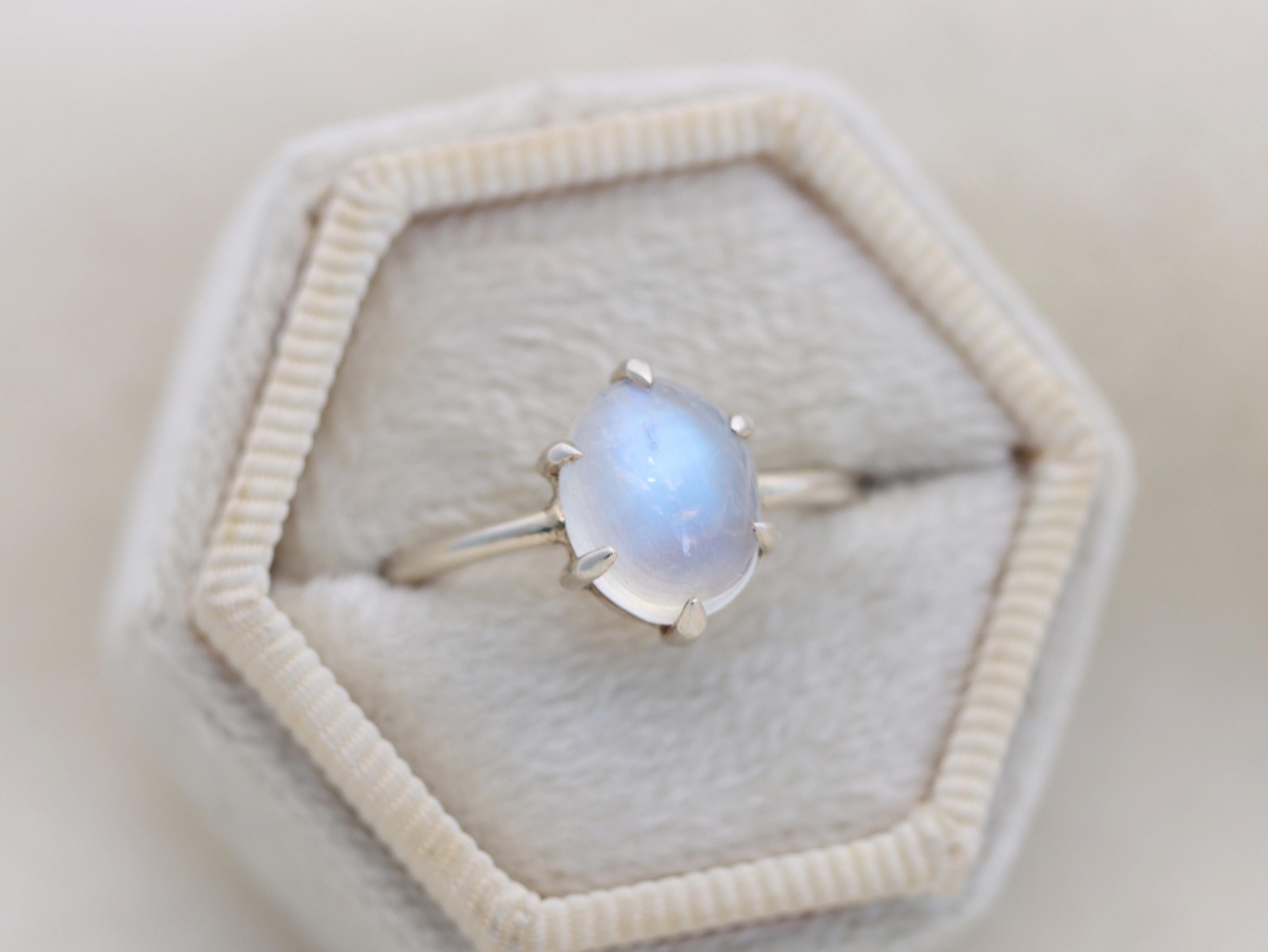 Moonstone has always been a particularly enchanting stone to me. It can be a shy stone, revealing it's stunning blue color only when light passes through the crystal structure of the stone. This colorful play of light will draw your eye day after day.