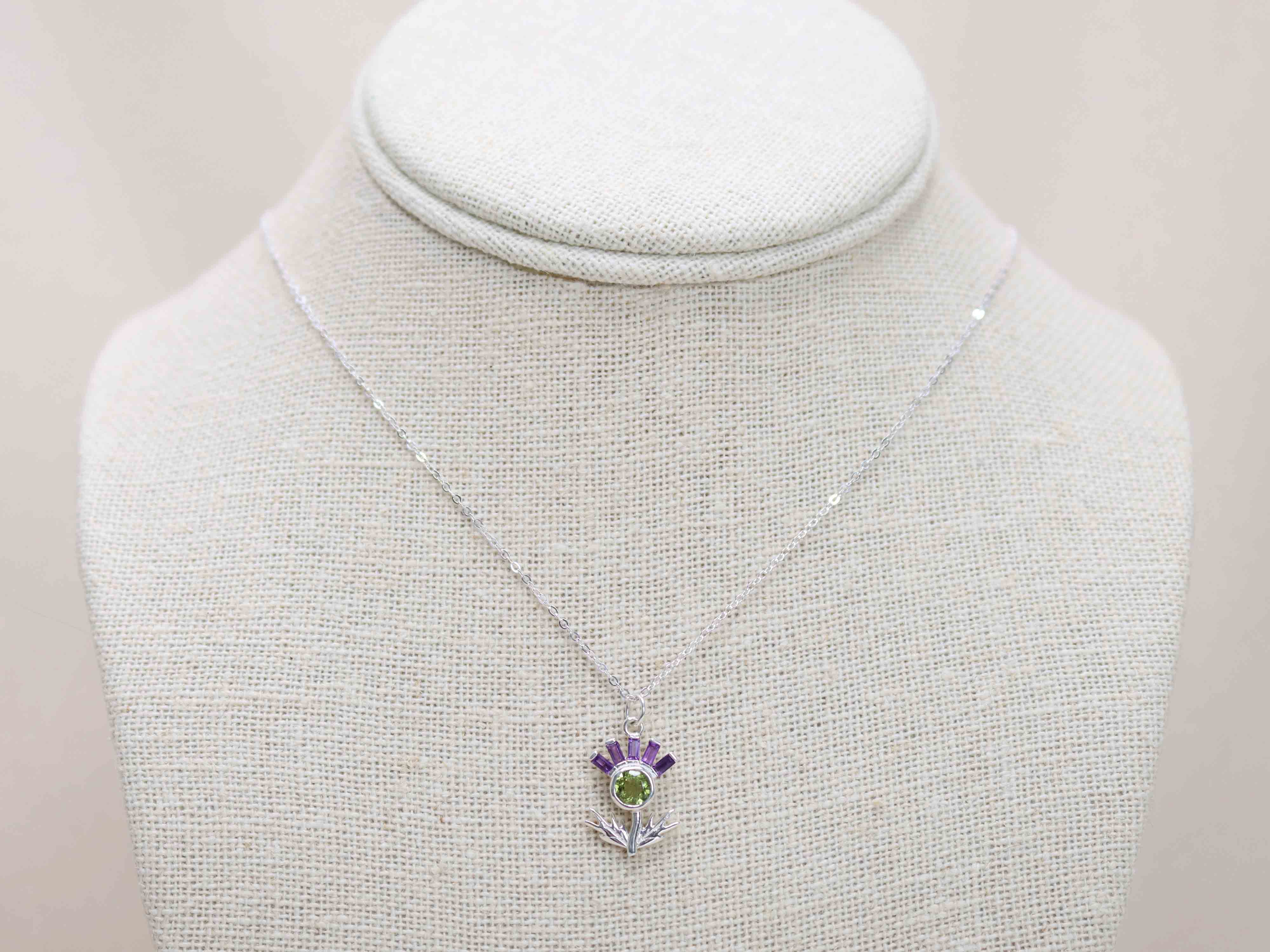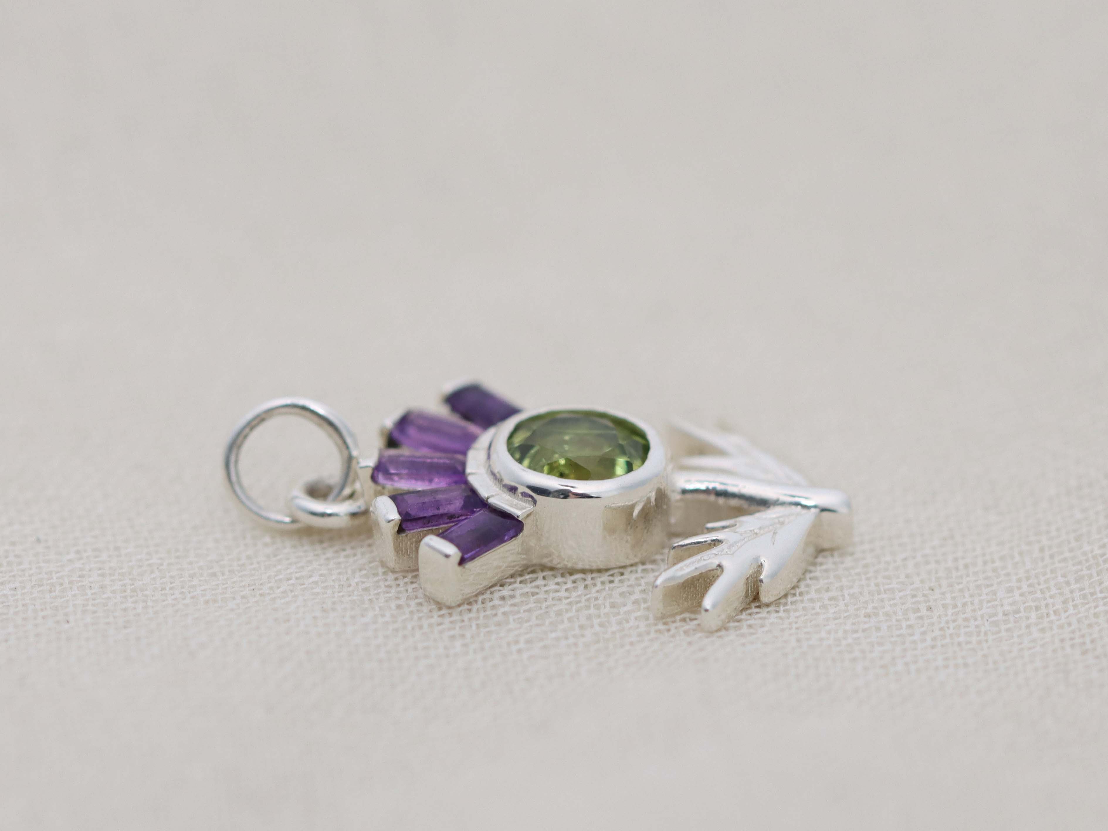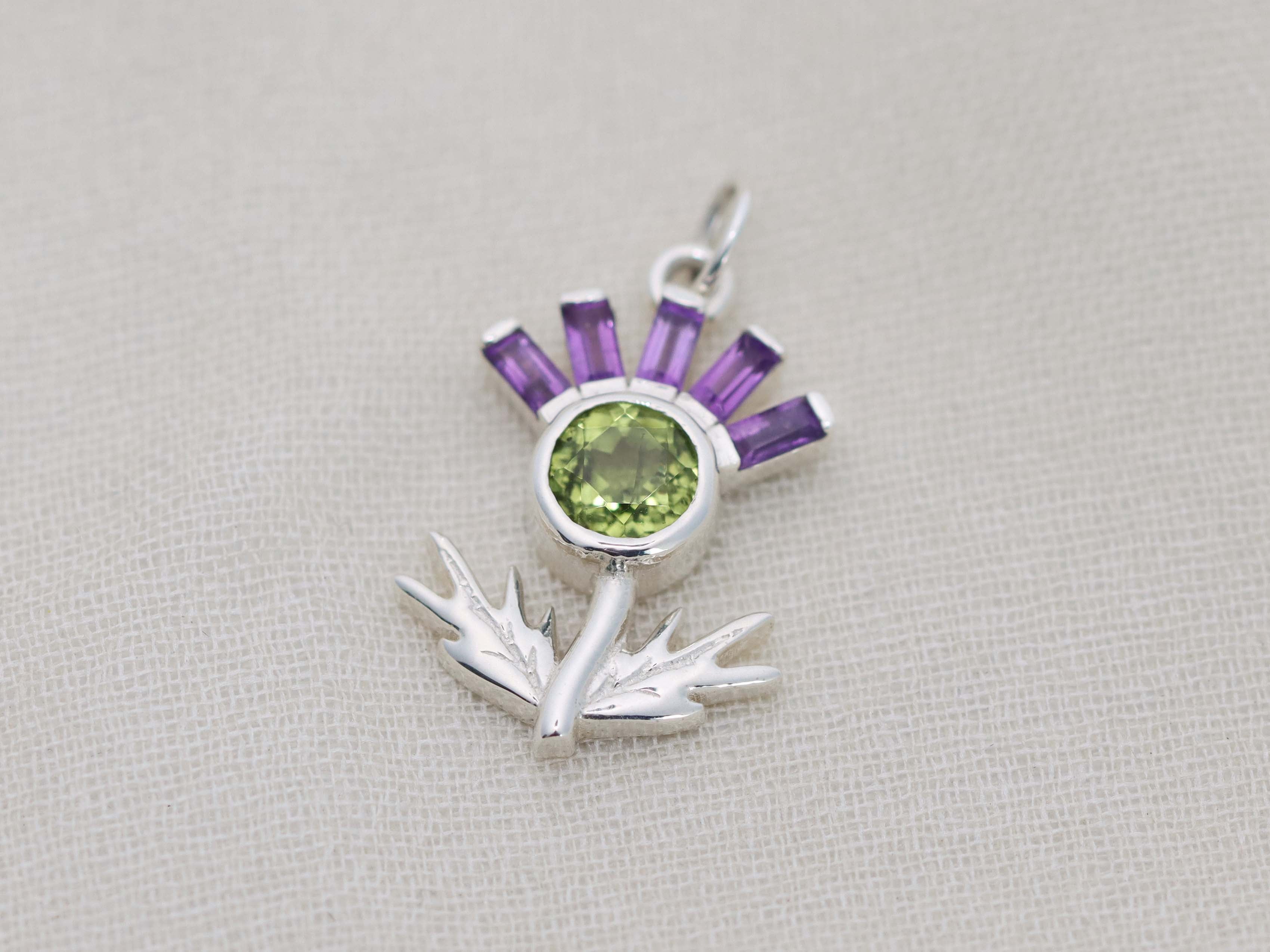 A modern interpretation of the Scottish thistle, this charm is set with colorful peridot and amethyst gemstones. The Scotch thistle has long been an important symbol of Scotland, featured on coins as early as the 1400s and recognized as the national flower of the Scot's today.