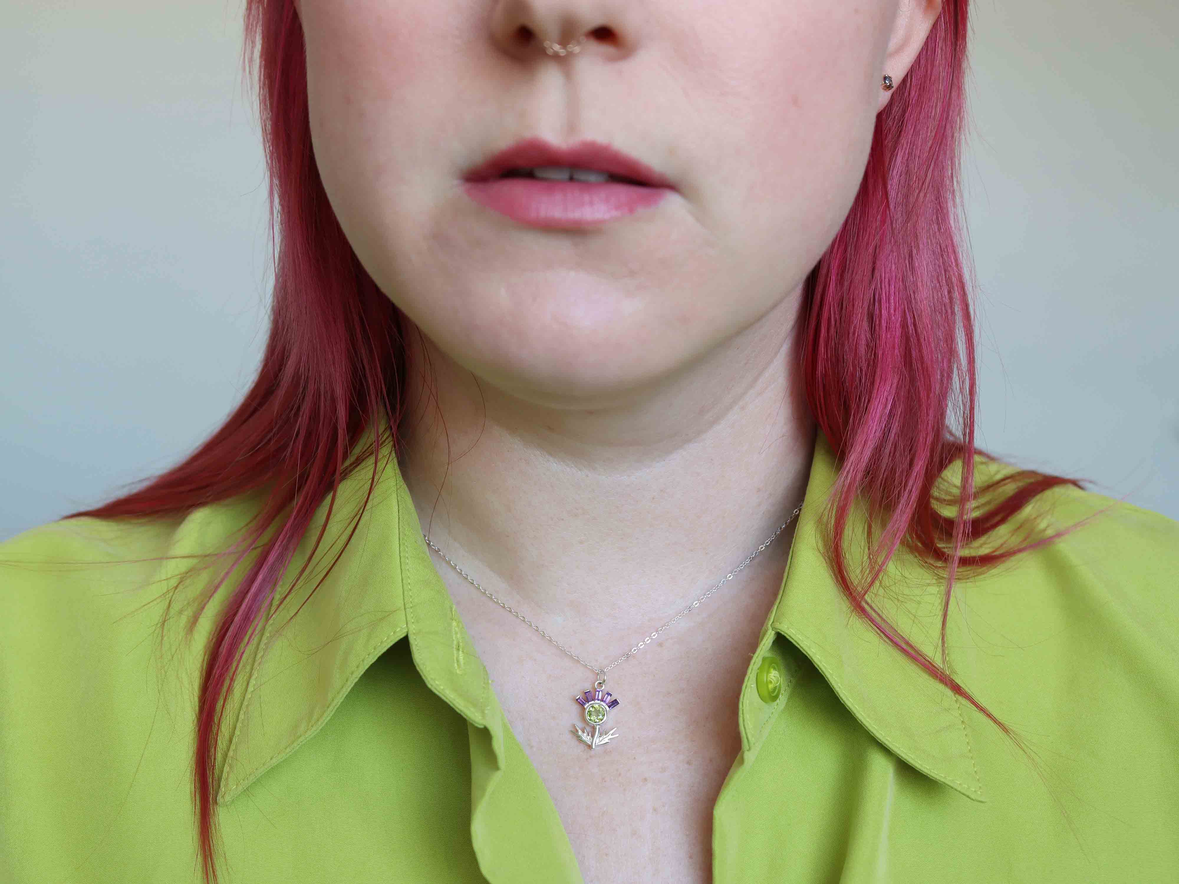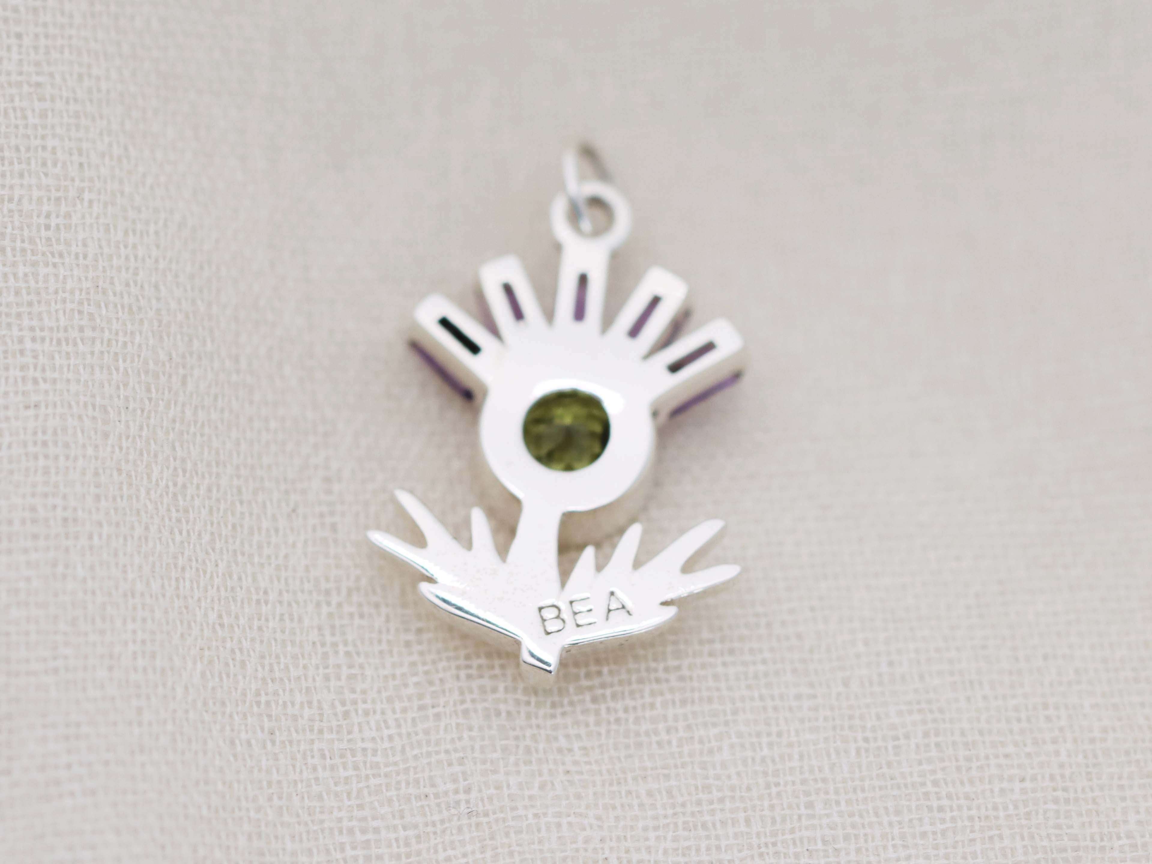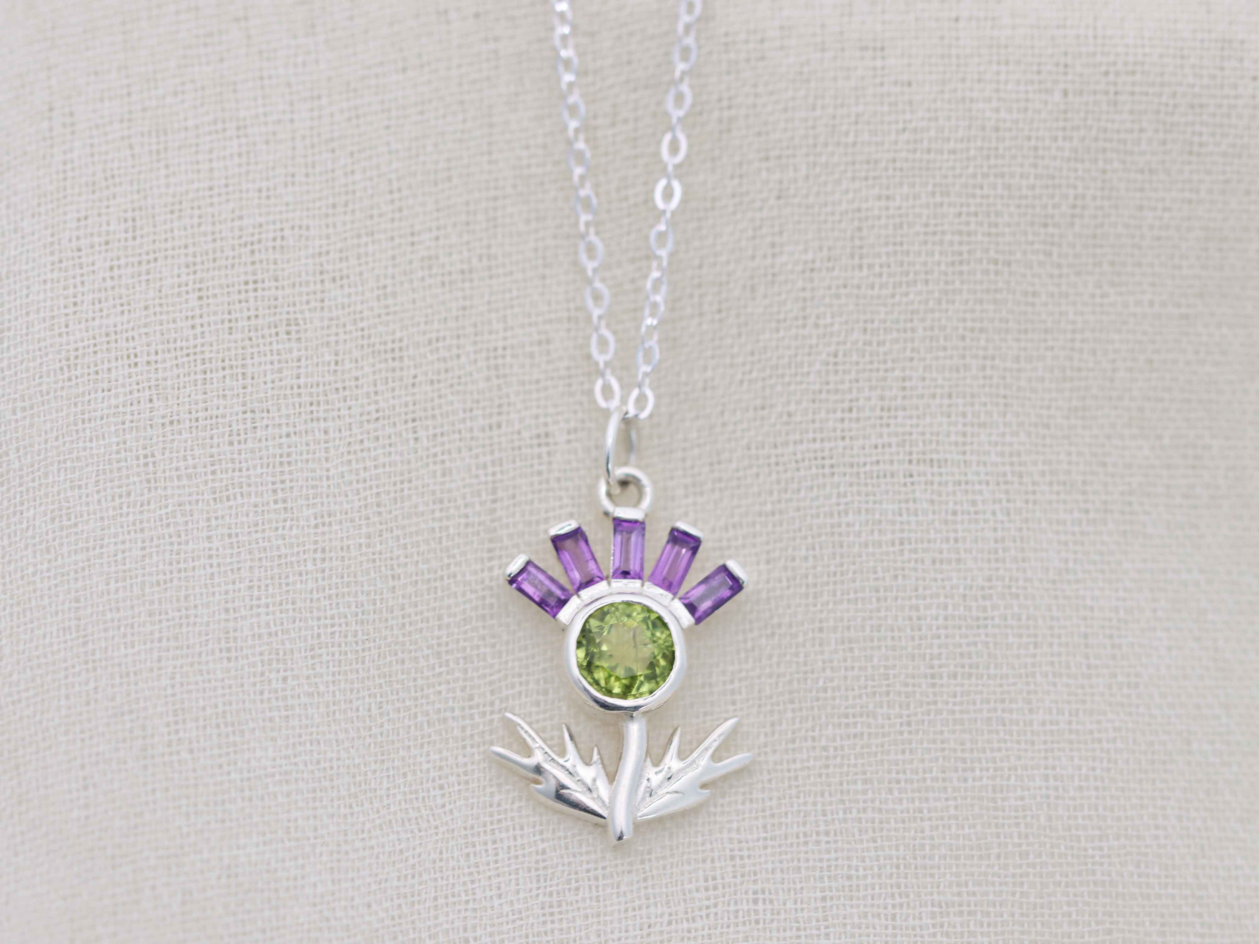 A modern interpretation of the Scottish thistle, this charm is set with colorful peridot and amethyst gemstones. The Scotch thistle has long been an important symbol of Scotland, featured on coins as early as the 1400s and recognized as the national flower of the Scot's today.