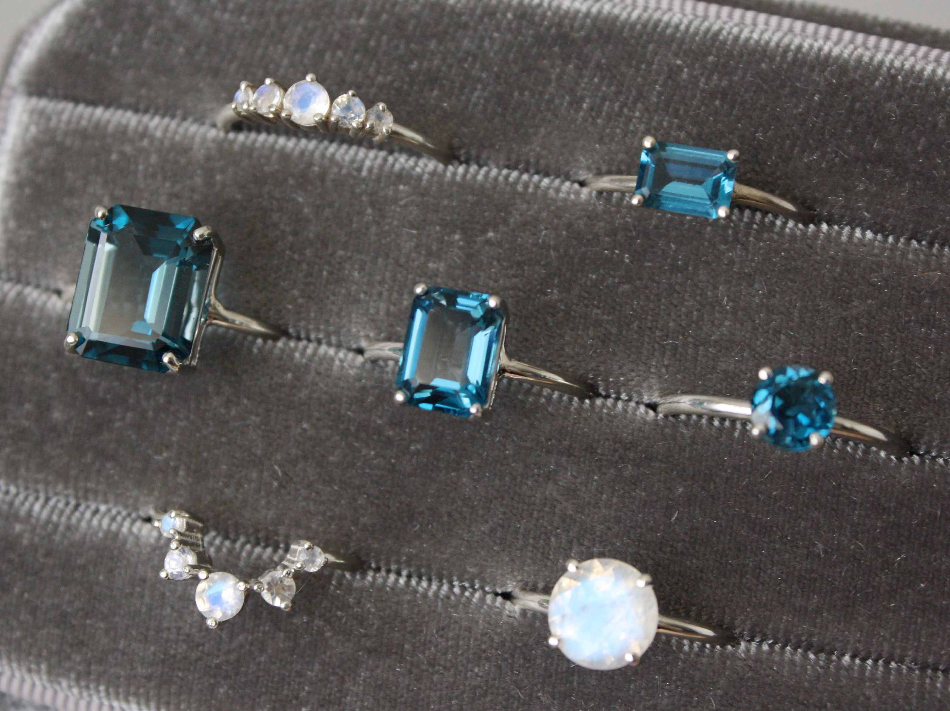 London blue topaz is a unique and deeply enchanting stone, one that completely mesmerizes me. This inky blue color is reminiscent of the mysterious deep ocean, and the facets on this ring glimmer like breaking waves in the sun. Featured in a timeless setting, this gemstone is a beautiful gift to yourself or others.