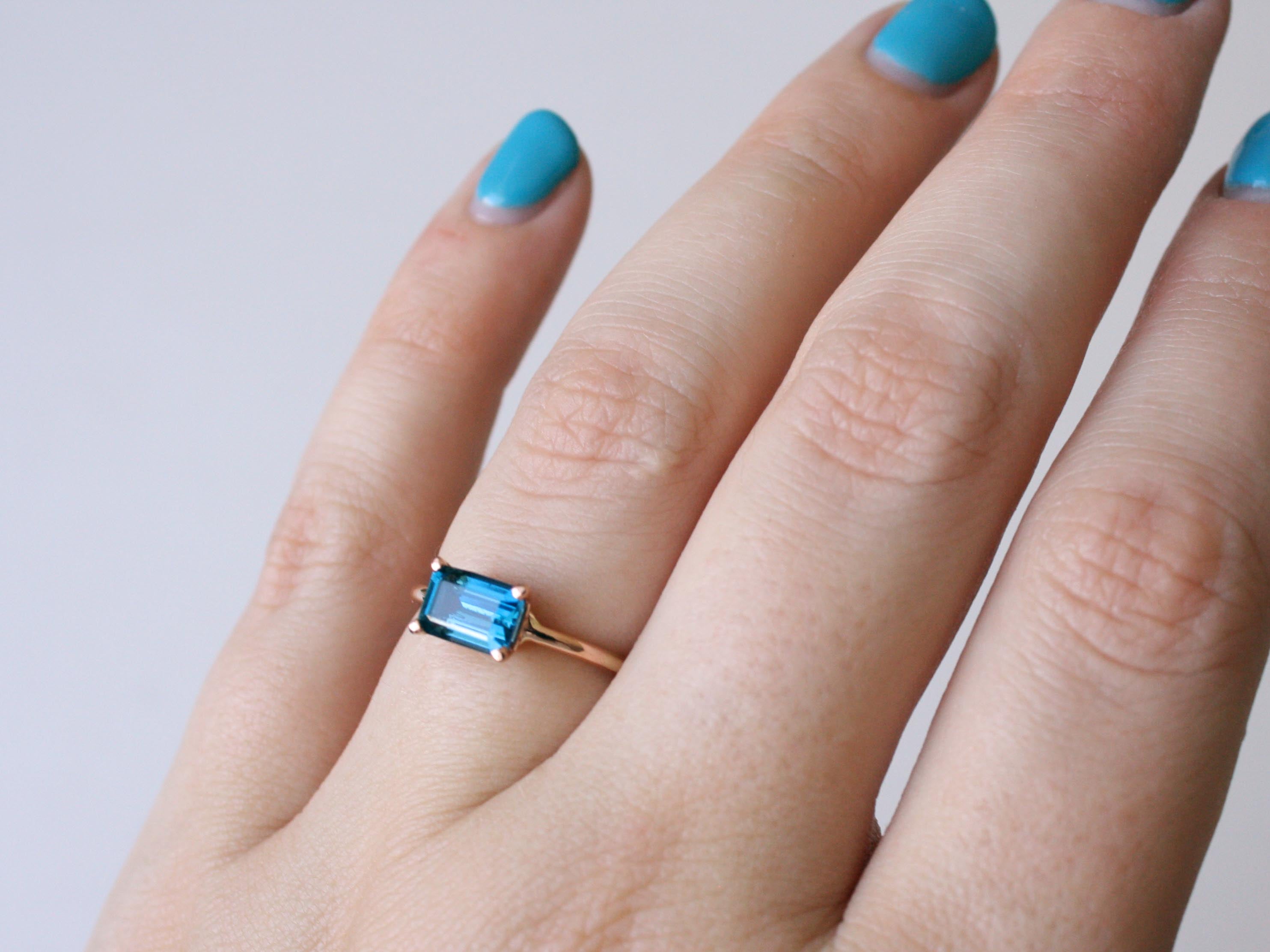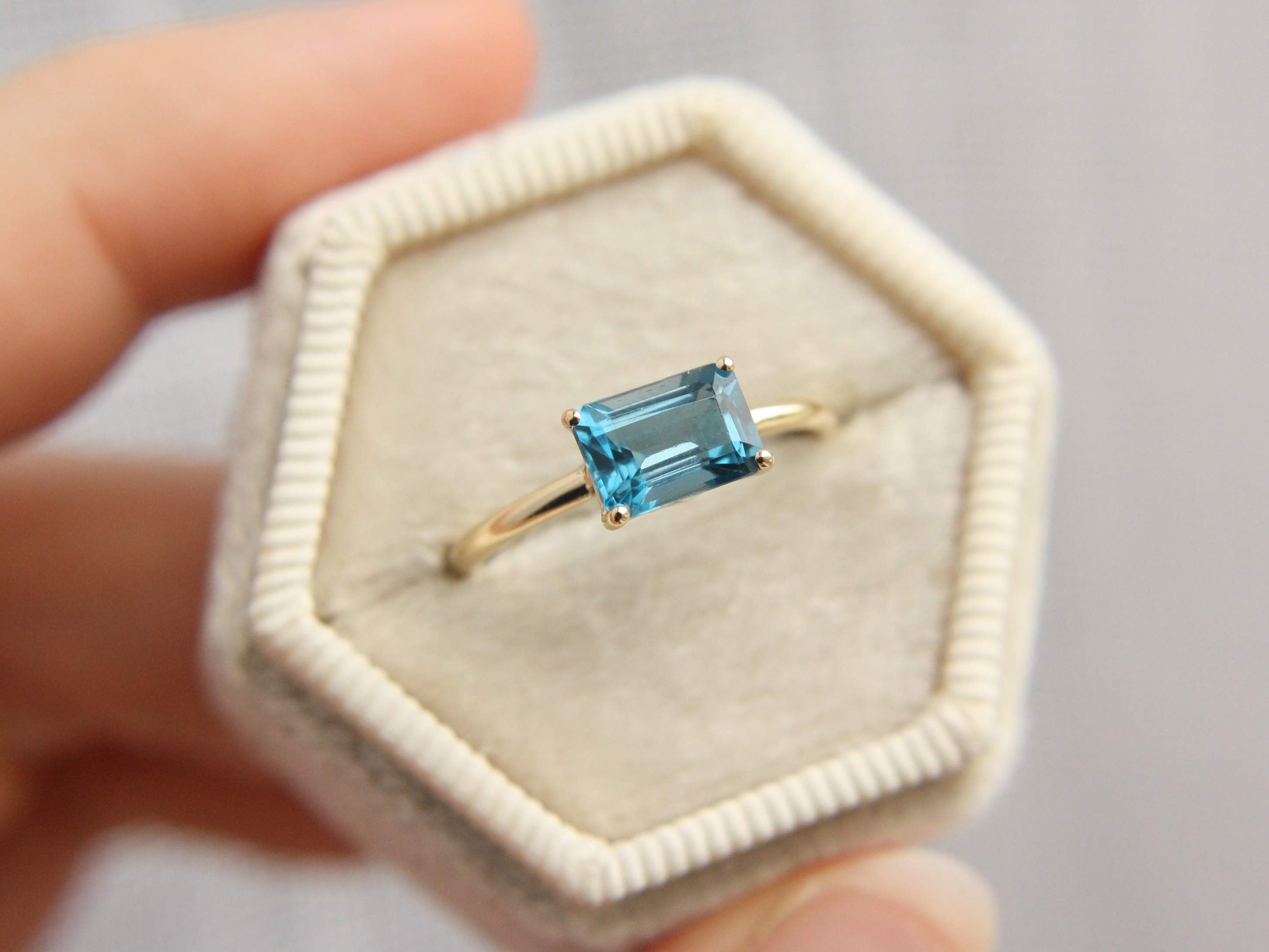 London Blue Topaz Solitaire Ring - East West 7x5 Emerald Cut